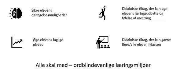 Det ordblindevenlige læringsmiljø er inkluderende og kendetegnet ved en ordblindevenlig undervisning i alle fag.