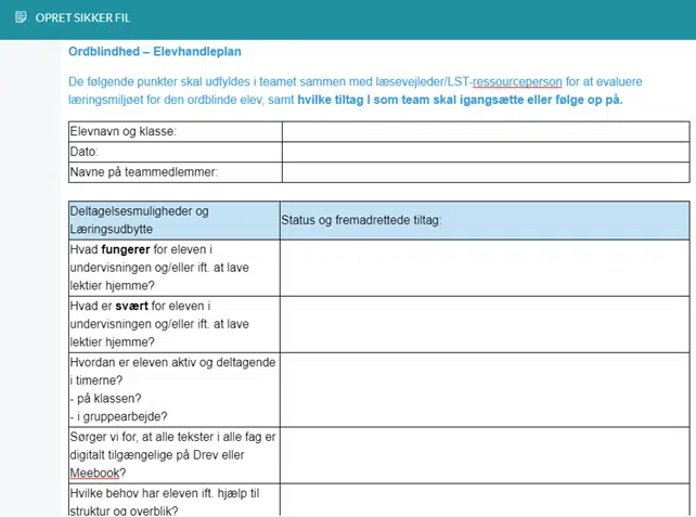 Lærerteamet kan benytte dokumentskabelonen Ordblindhed – Elevhandleplan, som oprettes og gemmes i sikre filer på Aula.
