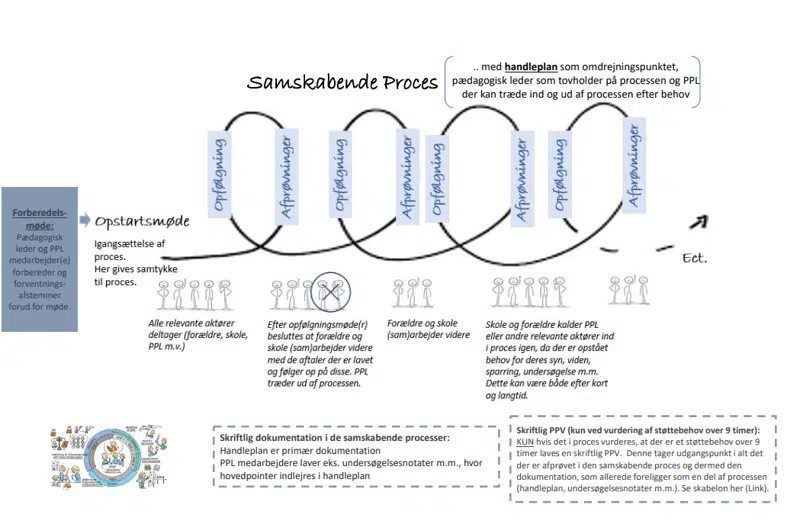 Det væsentligste i de samskabende processer er den måde, hvorpå møderne mellem aktører i barnets liv bliver afholdt. Disse møder er bygget processuelt op, hvor eks. medarbejdere på skolen, forældre og andre relevante medspillere interviewes om, hvad der går godt, hvad der udfordrer og hvad hver aktør konkret vil gå hjem og afprøve. Alle går ud fra mødet med en konkret opgave, som skal afprøves, inden man mødes igen. På denne måde er der fokus på, at de voksne omkring eleven gør noget andet sammen og en tro på, at det kan være med til at skabe bedre muligheder for, at eleven udvikler sig og trives.